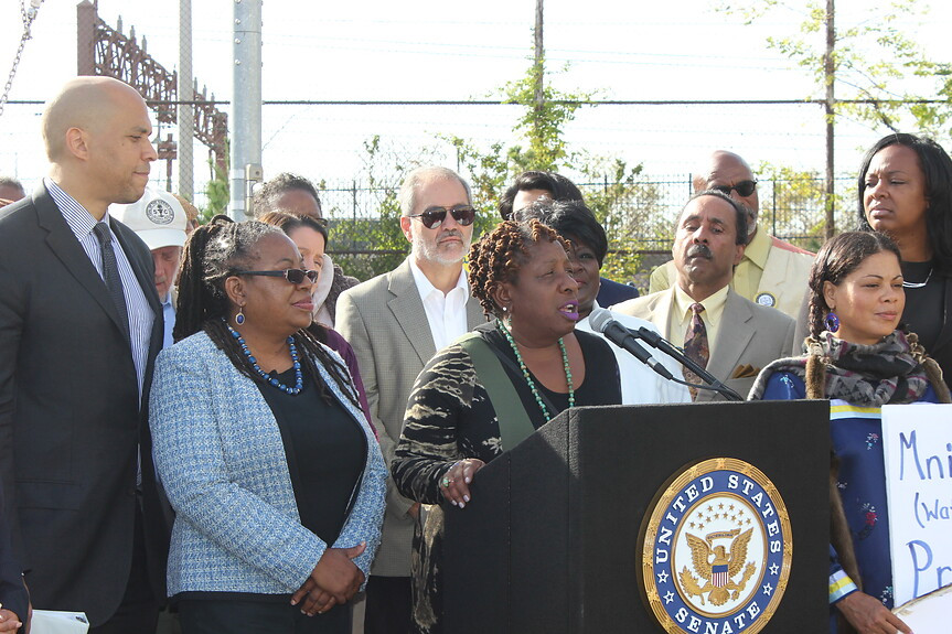 EJHA Co-Coordinator, Michele Roberts, speaking at a press conference with US Senator Cory Booker